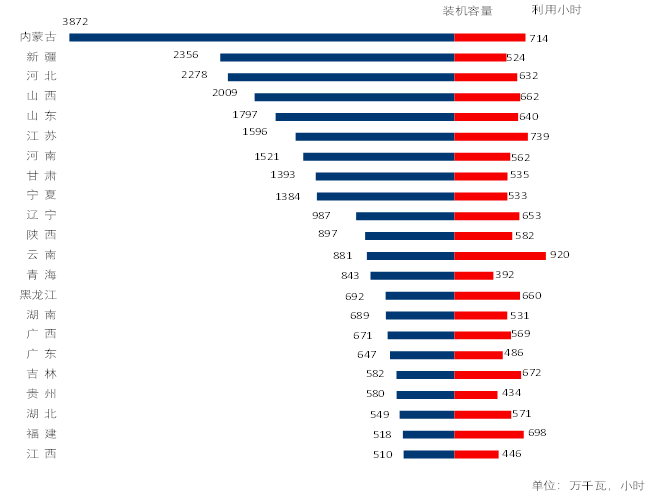 分類型看,1-3月份,全國水電設備平均利用小時為600小時,比上年同期降低21小時。在水電裝機容量排前10的省份中,除云南和貴州外,其他省份水電設備平均利用小時均同比降低,其中,湖南和福建降低超過100小時,分別降低225和187小時;全國火電設備平均利用小時為1116小時,比上年同期增加165小時,其中,燃煤發電設備平均利用小時為1160小時,比上年同期增加187小時,燃氣發電設備平均利用小時為620小時,比上年同期增加17小時。分省份看,全國共有16個省份火電設備利用小時超過全國平均水平,其中甘肅和新疆超過1300小時,分別為1415和1323小時,青海、四川、江西、陜西、廣西、湖北、寧夏、重慶、內蒙古、北京和安徽超過1200小時,而西藏僅為95小時。與上年同期相比,共有29個省份火電利用小時同比增加,其中湖北、重慶、四川、浙江、貴州、廣東、云南、湖南、江西、江蘇和福建增加超過200小時,分別增加433、409、379、348、297、283、282、253、230、217和202小時,而黑龍江和海南同比分別降低33和28小時;全國核電設備平均利用小時1817小時,比上年同期增加218小時;全國并網風電設備平均利用小時619小時,比上年同期增加69小時;全國太陽能發電設備平均利用小時300小時,比上年同期增加10小時。