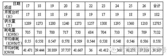 前后相比,10天供水量幾乎相等,而耗電減少1720KWH,平均單耗降低0.136KWH,節電率24.37%,平均時耗降低9.942KW/H,節電率25.37%,平均節電率達24.87%,節電效果顯著。