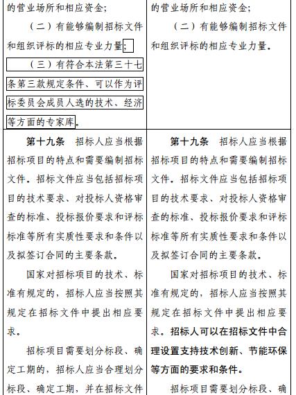 四、將第十九條第二款修改為:“國家對招標項目的技術、標準有規定的,招標人應當按照其規定在招標文件中提出相應要求。招標人可以在招標文件中合理設置支持技術創新、節能環保等方面的要求和條件。”