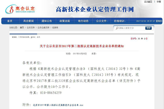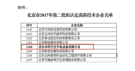 近日,國家高新技術(shù)企業(yè)認定管理工作網(wǎng)發(fā)布了《關(guān)于公示豐臺園2017年第二批擬認定高新技術(shù)企業(yè)名單的通知》,北京中科宇杰節(jié)電設備有限公司通過認證,榮獲“國家高新技術(shù)企業(yè)”的殊榮。