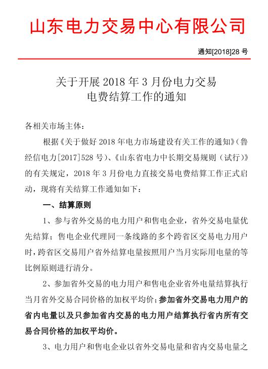 新聞中心日前,山東電力交易中心發布《關于開展2018奶奶3月份電力交易電費結算工作的通知》(以下簡稱“通知”)。通知中稱,參與省外交易的電力用戶和售電企業,省外交易電量優先結算。參加省外交易電力用戶的省內電量以及只參加省內交易的電力用戶結算執行省內所有交易合同價格的加權平均價。詳情如下: