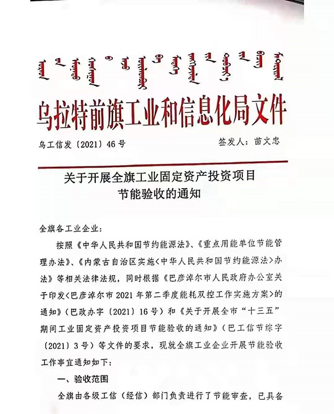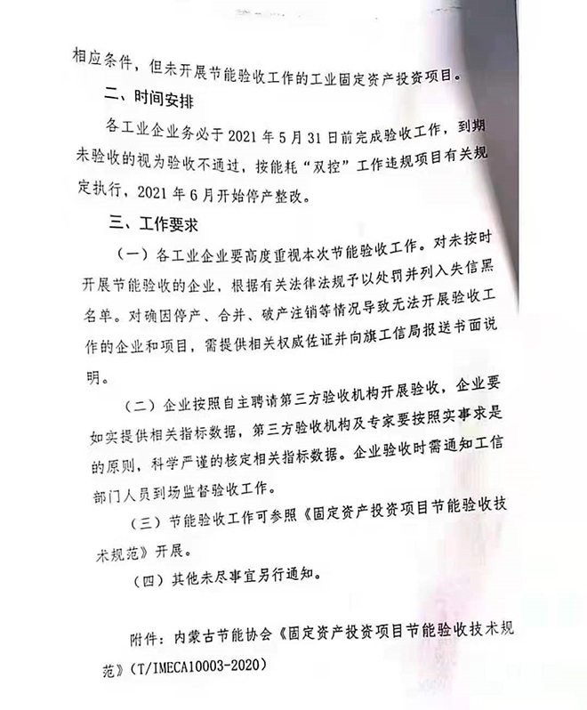 烏拉特前旗:對全旗工業(yè)企業(yè)開展節(jié)能審查驗(yàn)收,對期限內(nèi)驗(yàn)收不通過的企業(yè),按能耗“雙控”工作違規(guī)項目有關(guān)規(guī)定執(zhí)行停產(chǎn)整改。