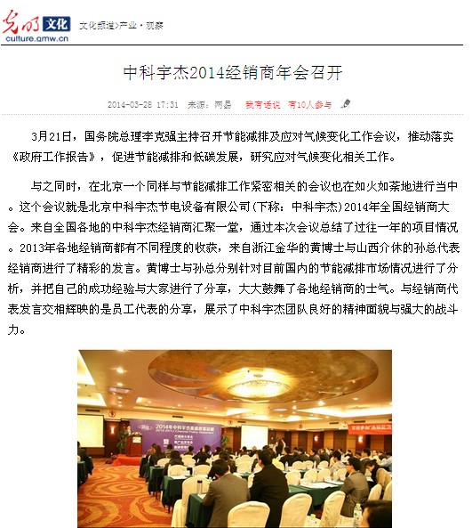 與之同時,在北京一個同樣與節(jié)能減排工作緊密相關(guān)的會議也在如火如荼地進(jìn)行當(dāng)中。這個會議就是北京中科宇杰節(jié)電設(shè)備有限公司(下稱:中科宇 杰)2014年全國經(jīng)銷商大會。來自全國各地的中科宇杰經(jīng)銷商匯聚一堂,通過本次會議總結(jié)了過往一年的項目情況。2013年各地經(jīng)銷商都有不同程度的收 獲,來自浙江金華的黃博士與山西介休的孫總代表經(jīng)銷商進(jìn)行了精彩的發(fā)言。黃博士與孫總分別針對目前國內(nèi)的節(jié)能減排市場情況進(jìn)行了分析,并把自己的成功經(jīng)驗 與大家進(jìn)行了分享,大大鼓舞了各地經(jīng)銷商的士氣。與經(jīng)銷商代表發(fā)言交相輝映的是員工代表的分享,展示了中科宇杰團(tuán)隊良好的精神面貌與強大的戰(zhàn)斗力。
