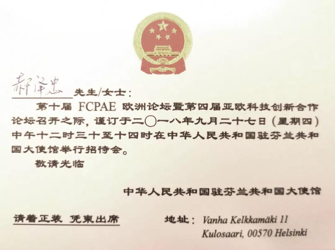 全球公益系列活動(dòng)在芬蘭傳遞期間正值第十屆FCPAE歐洲論壇暨第四屆亞歐科技創(chuàng)新合作論壇在芬蘭赫爾辛基召開,倡導(dǎo)環(huán)保節(jié)能低碳的公益活動(dòng)得到了論壇舉辦方以及中國駐芬蘭大使館的廣泛關(guān)注和大力支持,以中科宇杰董事長(zhǎng)郝澤忠為代表的宣傳團(tuán)一行受邀出席中國駐芬蘭大使館招待會(huì)。
